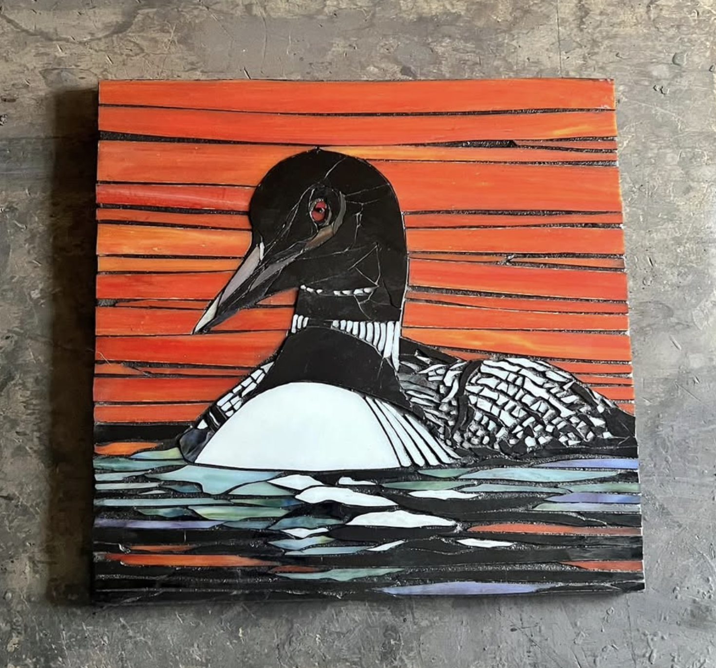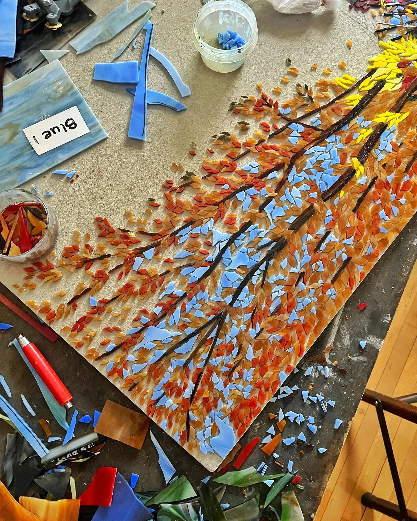 I started with a rough sketch on tilebacker board. Then I break glass—and lots of it! All my mosaics are made by me, hand-breaking glass with a wheel cutter or an oil cutter tool. I then glue it to the base as I go. Once I’m done cutting glass, I grout the piece like you would a tiled floor or kitchen backsplash.